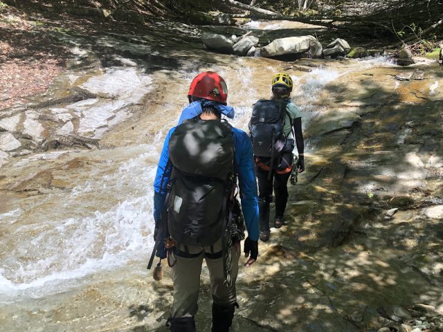 名前の通りナメ続きの穏やかな沢です。登攀はほぼ無く、沢登りというより沢歩きがメインになるので初心者でも行きやすく、開けた大きなナメが続く景観には心が和らぎます。天候にも恵まれ緩やかなナメを楽しむナメラ沢の山行、今回は星野さんが企画して下さり、古巻さん・私の3名で行ってきました。
