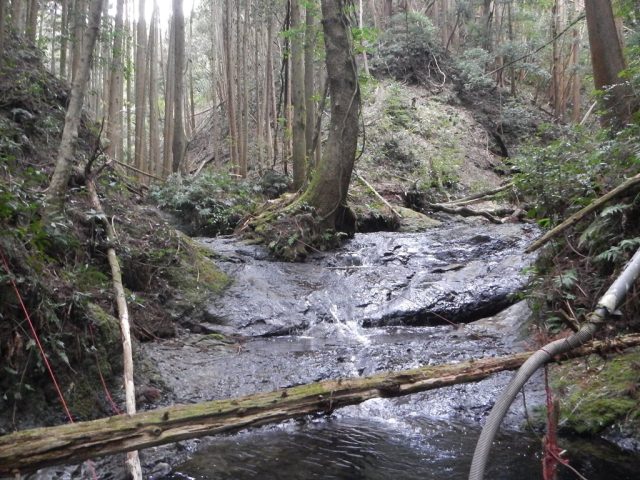 Co160二俣からもナメが続き、気をよくしていると、20分ほどで左岸に何やら小屋が建っている。取水しているような様子だ。小屋前の小さな堰堤を越えていくと、なんと沢は完全に用水路の風情に…