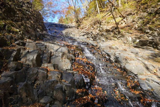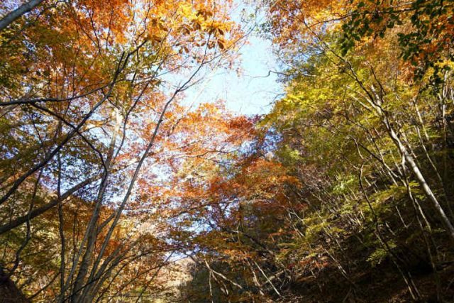 530の二又近くになると上部に紅葉が広がる。なめ水流の横には落ち葉がたくさん
