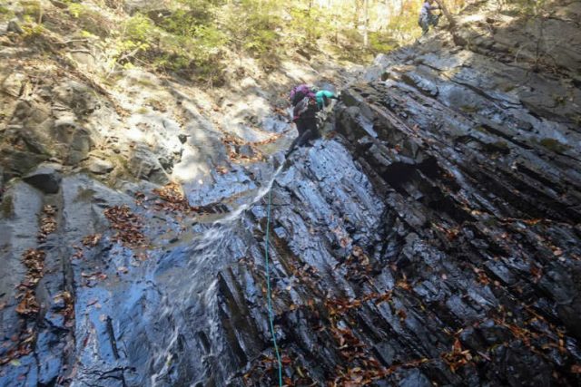 釜付きの3Mはヘツって登る。火山地帯の岩は崩れないか確認すればヘツっても登っても登りやすい。その後出てくる15Mの滝もリーダーはフリーで登っていく。