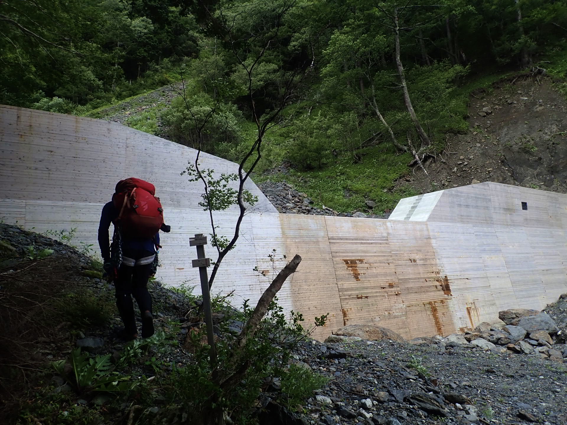 出合からすぐに造りかけの堰堤と出来たばかりで外側の木枠が取り外されてない白い堰堤。