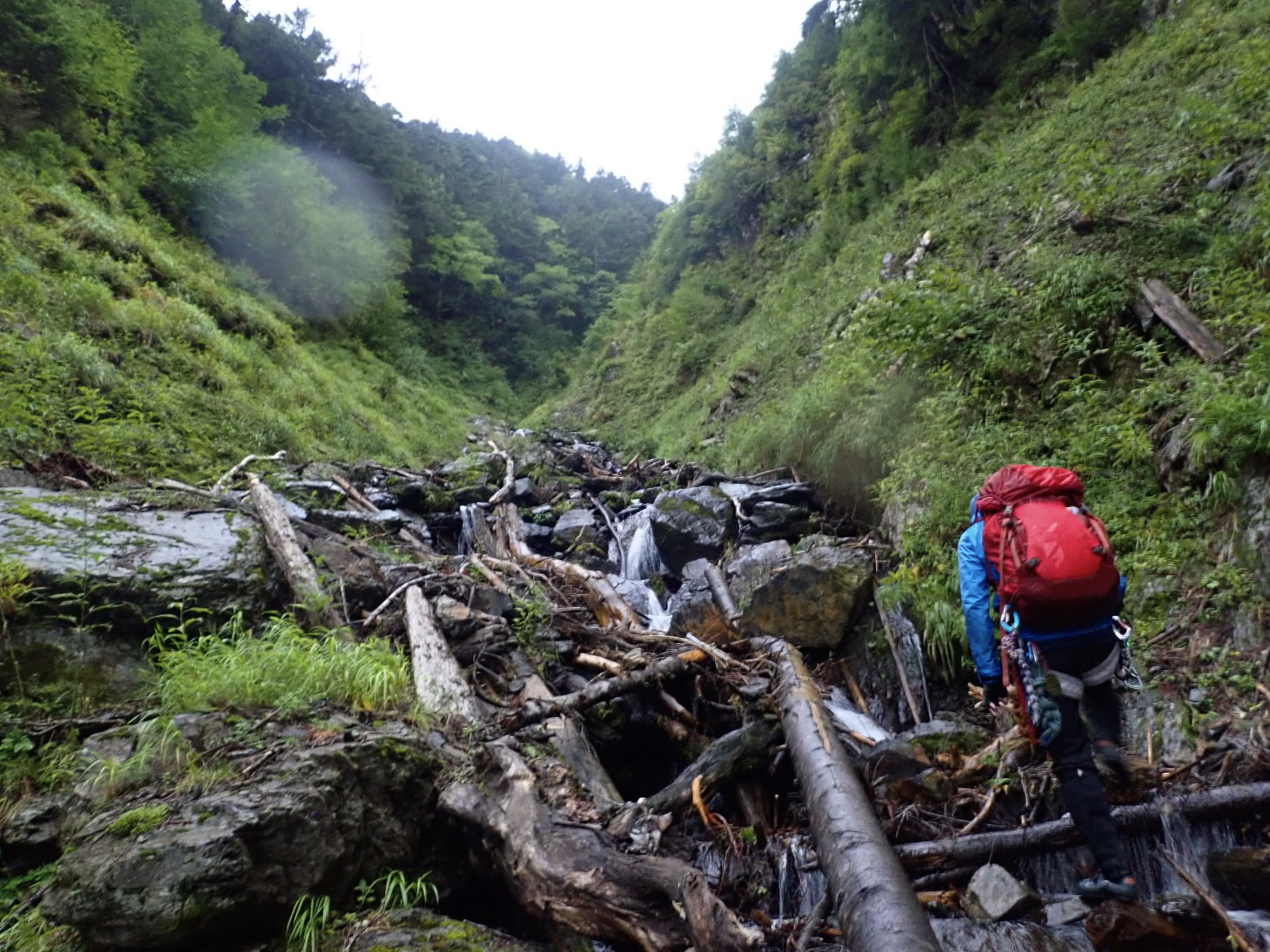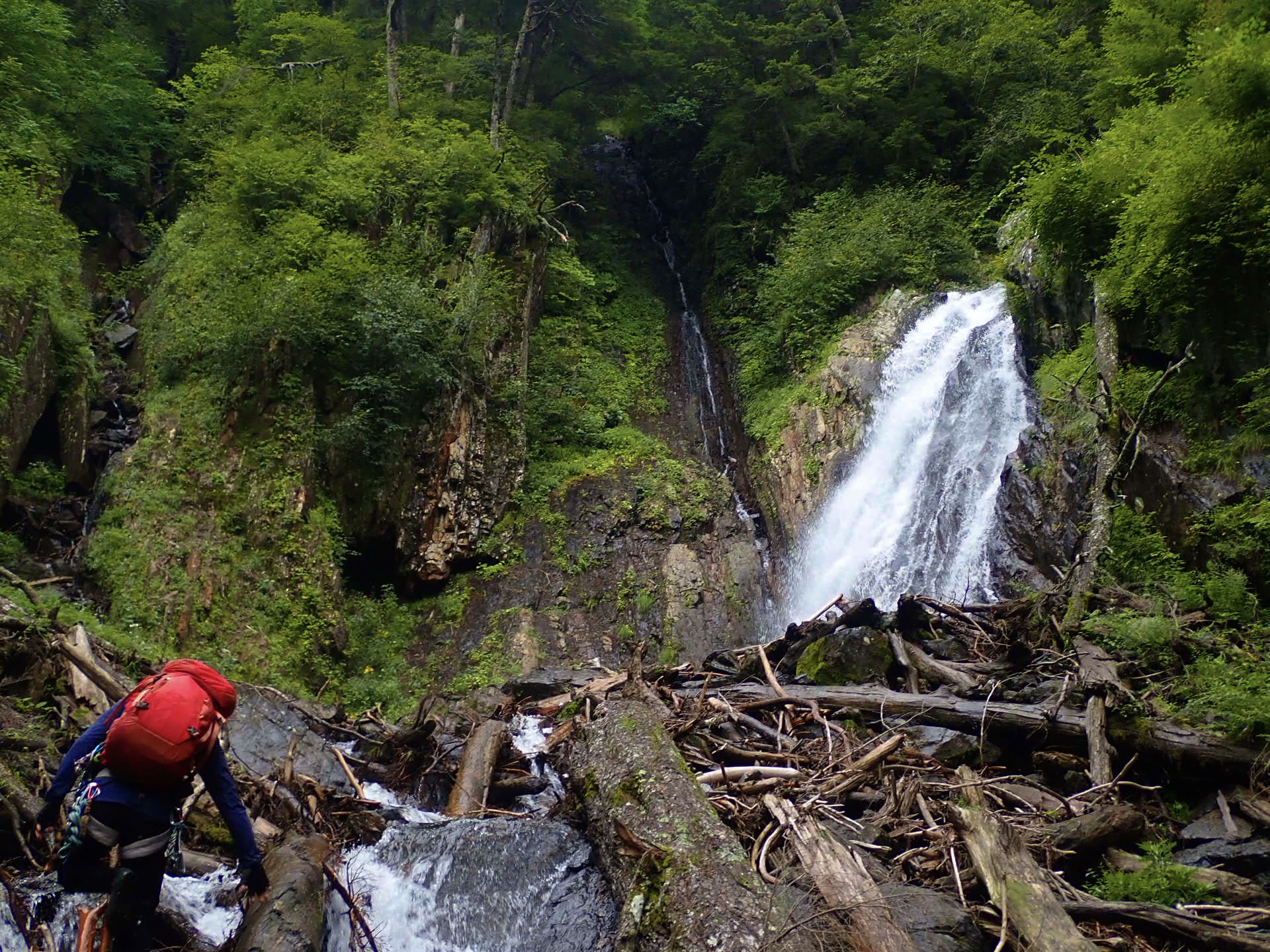 沢は直前の雨で増水気味、濡れてない場所はなくスリッピーなコンディション。全体的に倒木瓦礫が多くて丸太が滑る滑る💦