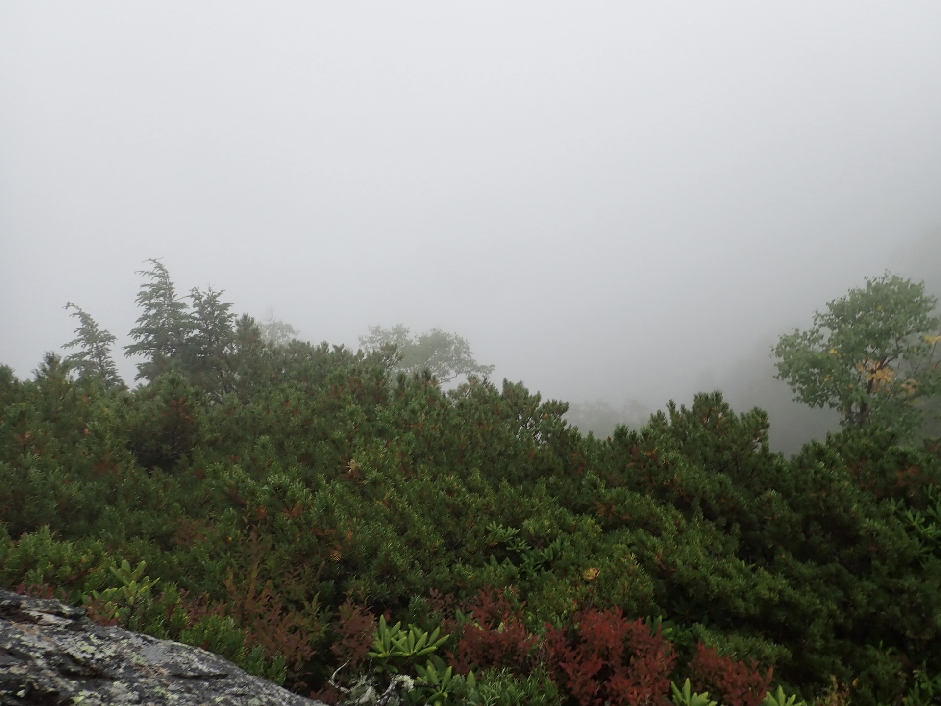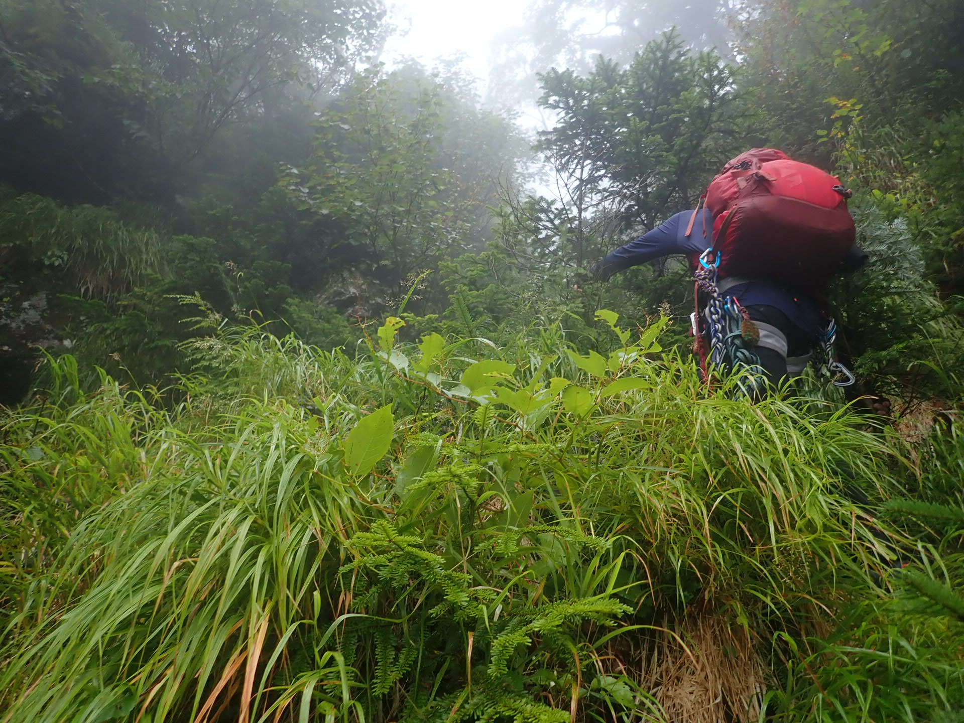 濃い雲の中、尾根に上がれば雲の上に抜ける事を信じて瓦礫を登っていく