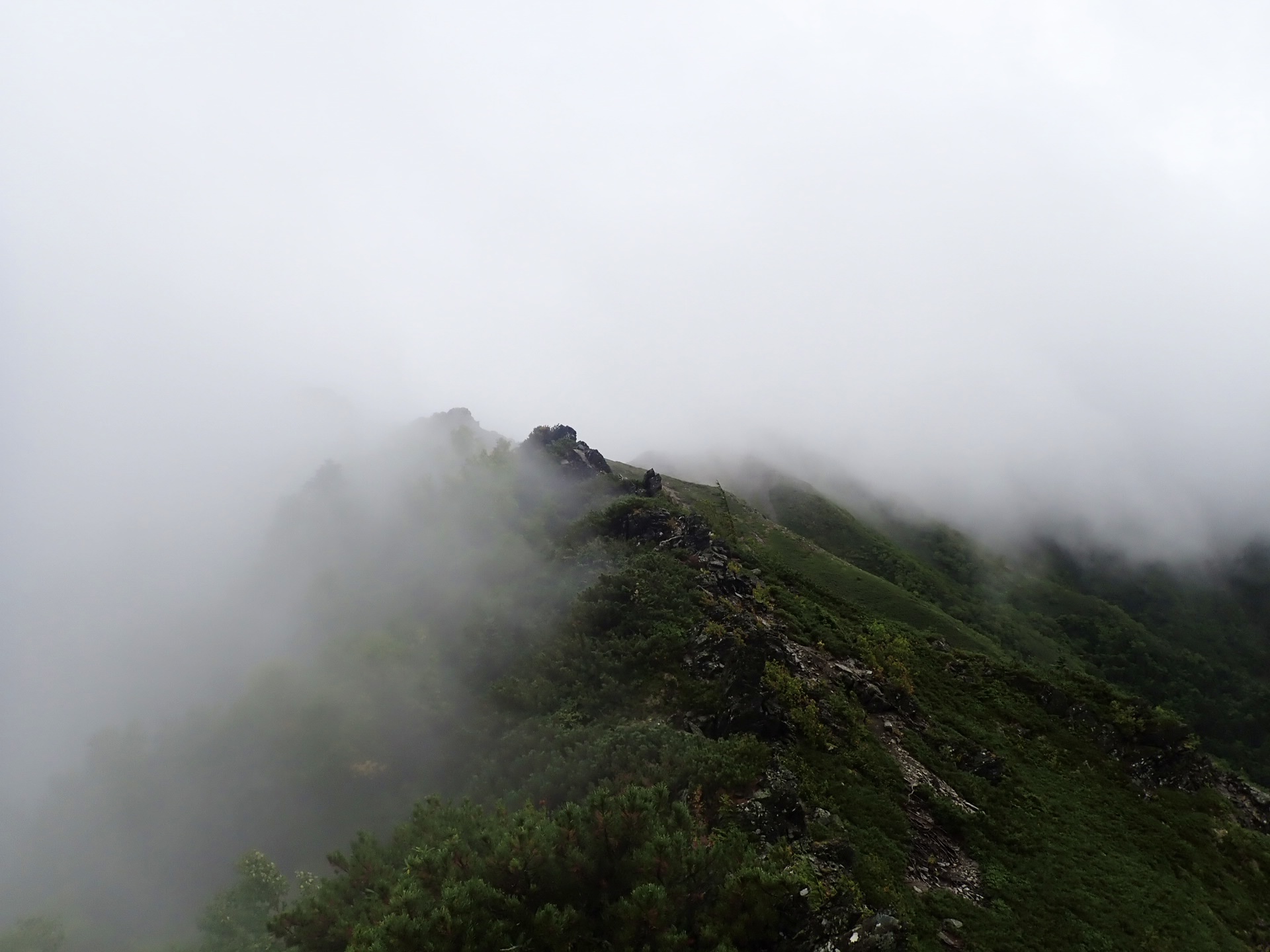 ガスガスの強風。。。体が煽られるぐらいの風で恐らく強い時は風速20mはあったかと。 尾根に辿り着いた事に安堵して小太郎尾根分岐までの地味な登りがきつかった。