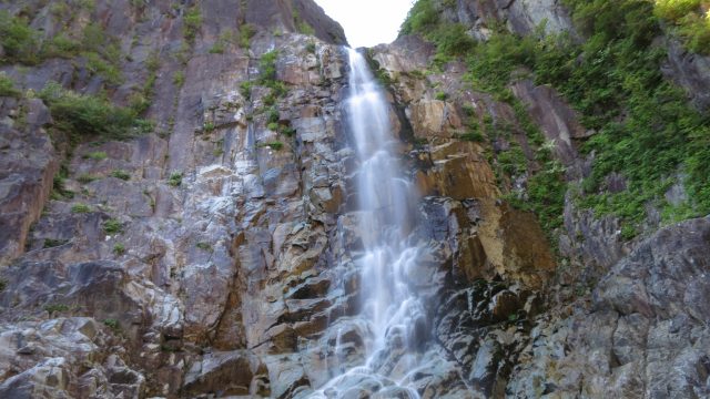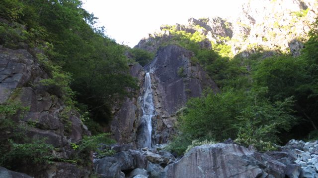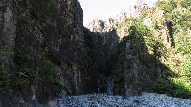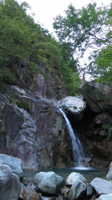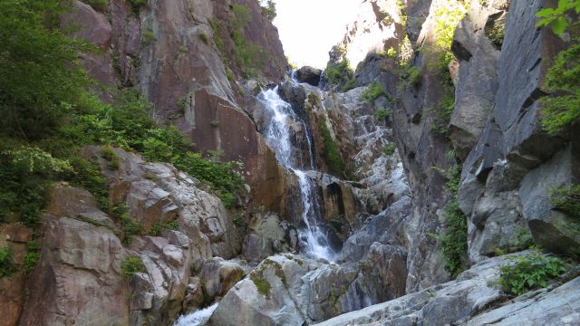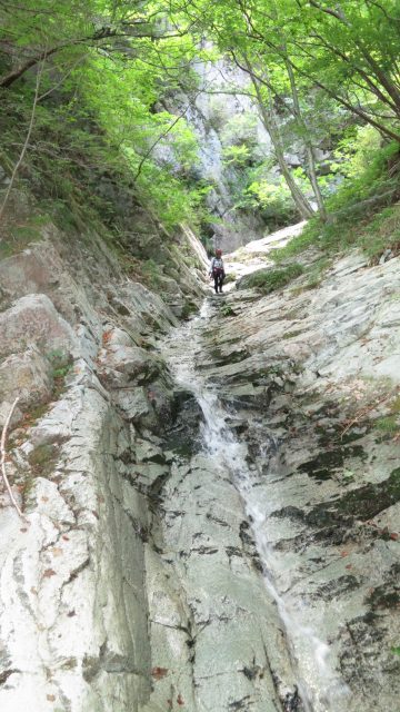 その後、ゴーロを進むとほどなくF6(2段20m)が迎えてくれます。この滝が最後になるのと落ち口の突破がポイントらしいのでじっくり時間を掛けて登りました。落ち口は滑るので注意が必要ですが水流を受けながら進んだので汗ばんだ体がクールダウンされ気持ち良かったです。落ち口上部のハーケンは新しいものに付け替えられていました。セカンドの同行者にはロープを垂らして確保してから登ってもらいました。(結局、ロープを出したのはここのみ)