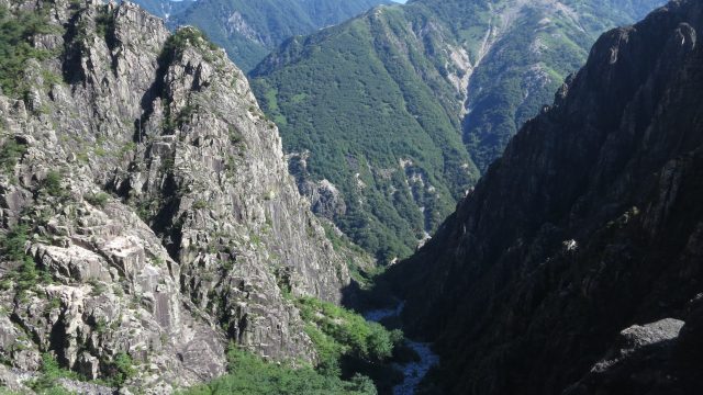 そしていよいよ核心のF4(40m)です。「要塞のような岩壁から流れ落ちる滝」と紹介されていますが想像通り見ごたえがあります。周囲の空間が開けているので錯覚して落差を感じさせないですが、近づいて下から見上げるとまさに大迫力です。ここは初めから巻く予定なので先人たちの記録を良く調べましたが「右のルンゼを登る」とあるだけで具体的なルート記述が見当たらなく心配していました。実際には「ここ」という所には僅かですが踏み跡がありました。トラバースも高度感はあるものの、しっかりした灌木を手掛かりに落石に注意して進めば危険は感じませんでした。そして、この巻きルートからの景色がとても素晴らしかったです。