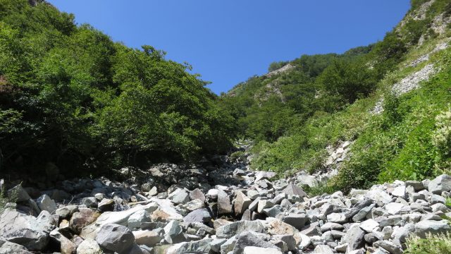 朝5時に銅親水公園に集合、支度を整え5時20分に出発。松木川に沿って林道をひたすら歩きます。途中、河原にはシカの群やイノシシ、ヘビなどが闊歩し、なんだかサファリパークを歩いているような感じでした。林道は途中踏み跡が無くなり川原へ降りる個所もありますが暫くすると再登場するので復帰します。途中ではこれまた気になっている無名沢の出会いとガレている詰め個所も確認出来ました。単調な林道歩きに疲れを感じてきた頃、ようやく最後の堰堤を超えウメコバ沢の出会いに到着です。ここまで約1時間40分。早朝にもかかわらずたっぷり汗をかいてしまいました。