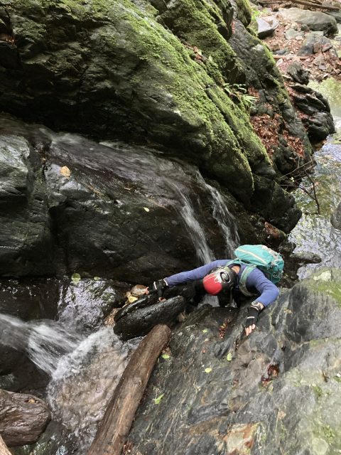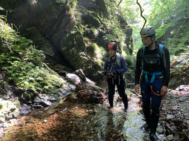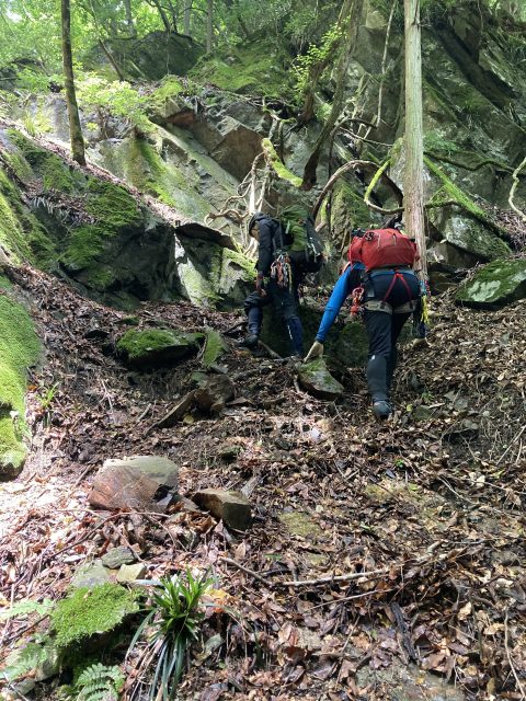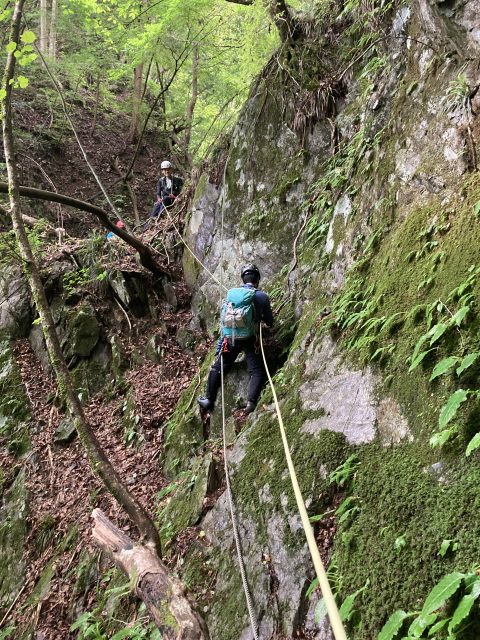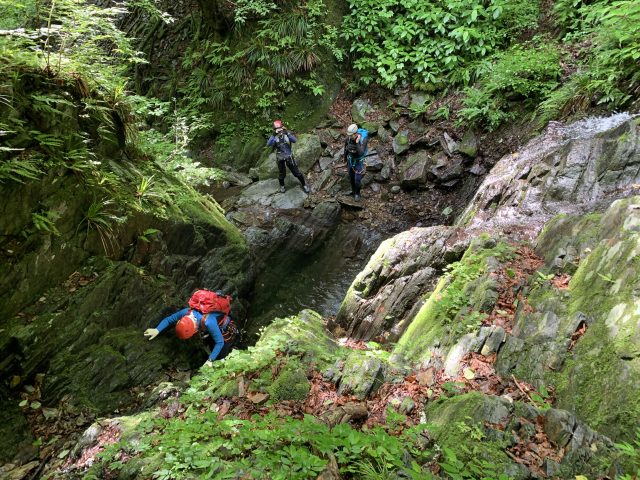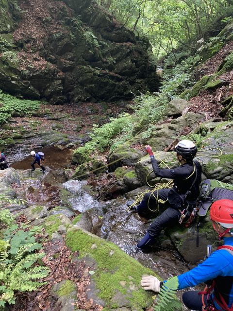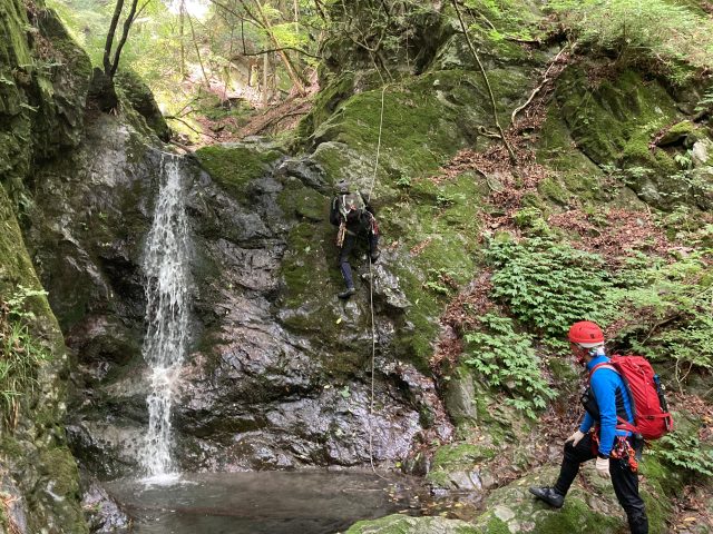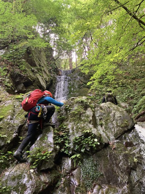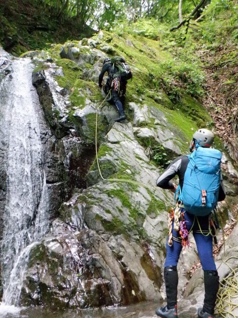 大滝、CWに続いてアクセントとなる滝が水流右にロープが垂れている6mと10mだ。6mはロープを頼らなくても登れるくらいホールドがあり楽しく登れる。みんなでどのラインが良いかな?と観察しながら登った。