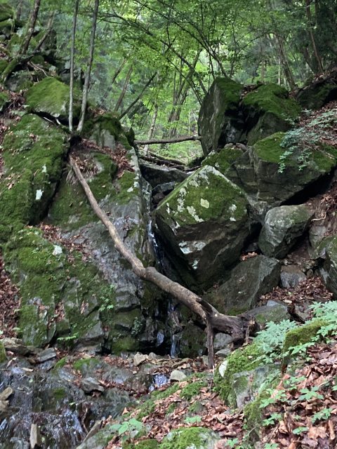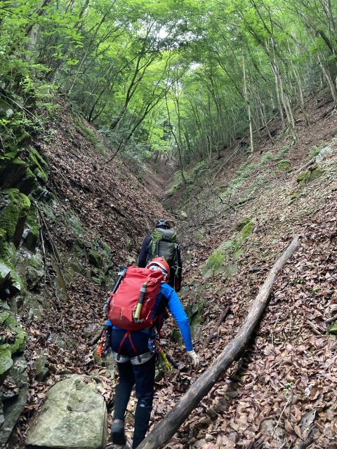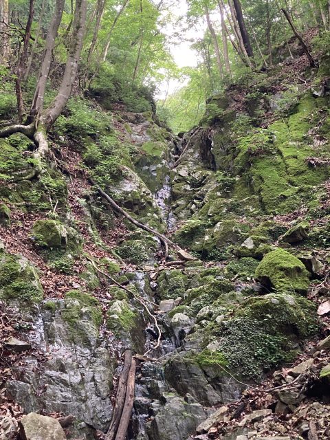 Co760を越えた辺りから水量が一段と減り所どころ伏流になり始めた。Co850付近でトイ状の涸れ滝を最後に詰めの様相になる。尾根まで沢型が残り、比較的楽に進める。