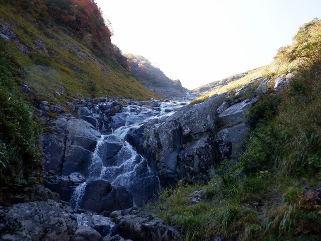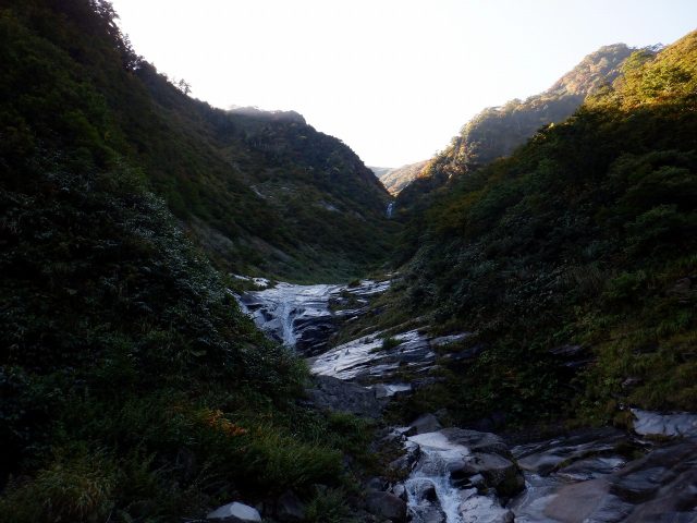 次第に沢へ陽が差し込んでくる。上越の山々は 紅葉が始まっていた。