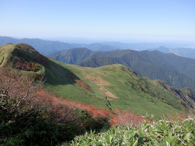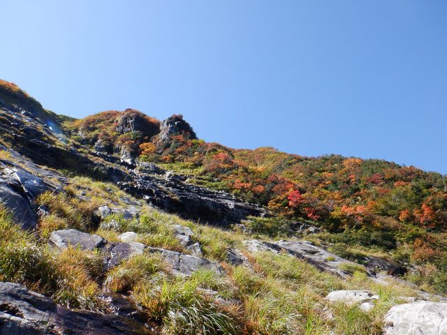 紅葉の始まった山々を見ながら 平標新道を下る。